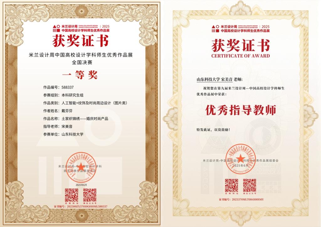 近日,从2025米兰设计周中国高校设计学科师生优秀作品展“人工智能+纹饰及时尚周边设计”课赛结合邀请赛决赛现场传来捷报。我院视觉传达设计系戴芬芬同学(指导老师:宋美音)凭借作品《土家织锦绣——婚庆时尚产品》从全国115所院校、145个教学班的激烈竞争中脱颖而出,最终在浙江理工大学举办的现场决赛中斩获国家级一等奖最高荣誉。
