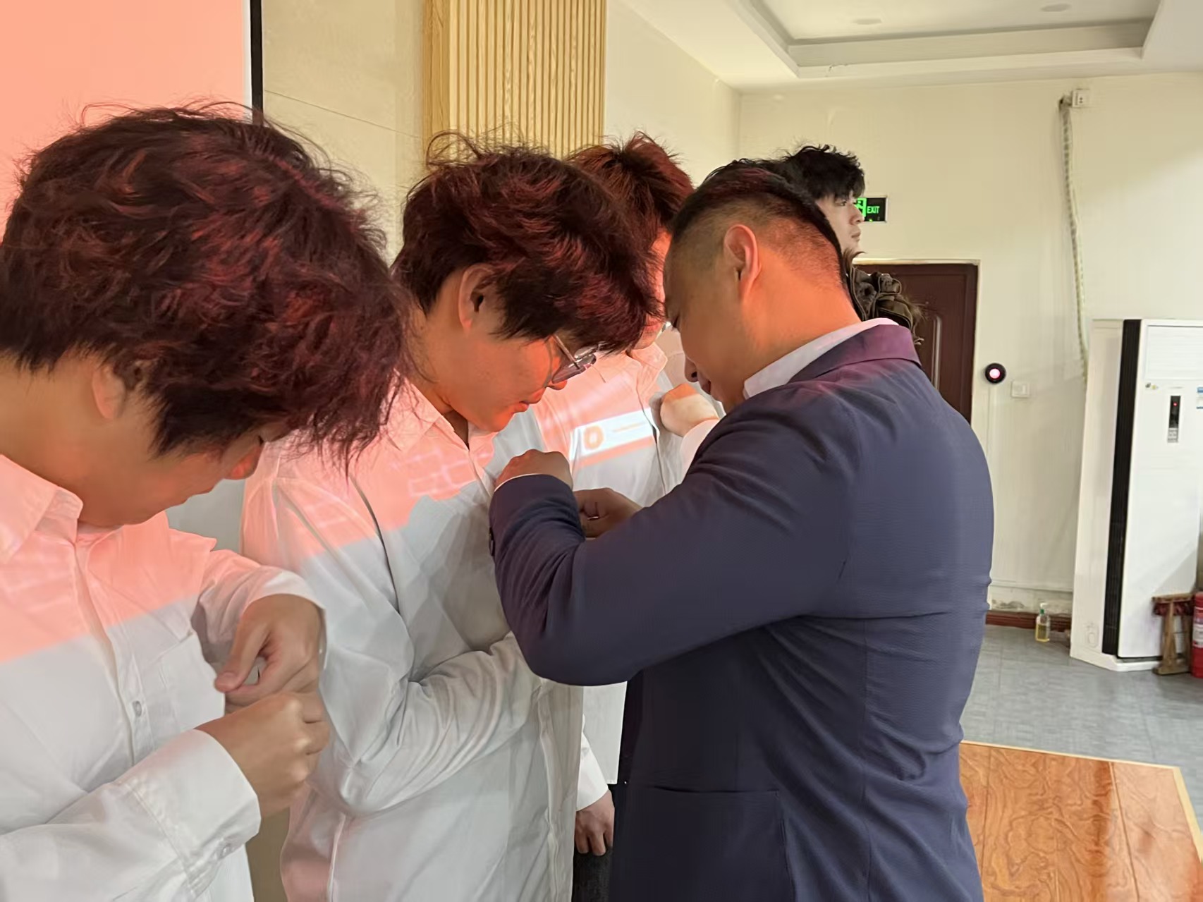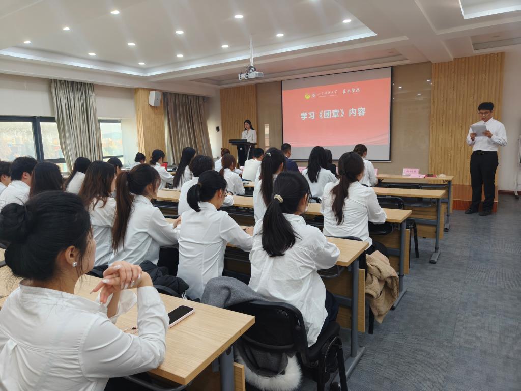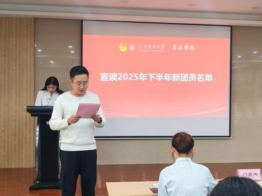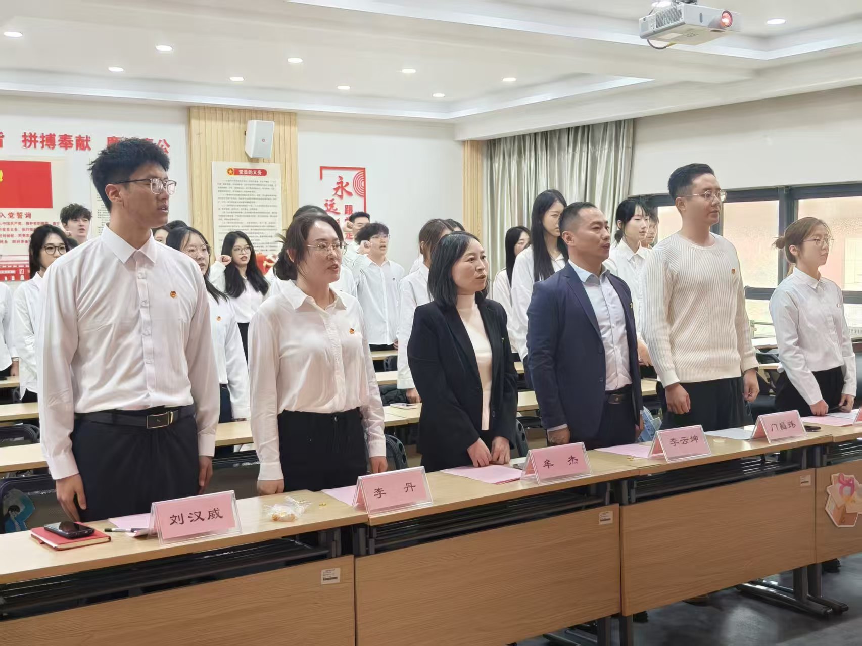 活动以齐唱国歌的庄重形式拉开序幕,随后由刘汉威带领全体参与人员学习《团章》核心内容,明确团员的基本权利与责任义务;紧接着由门昌玮老师宣读2025年下半年新团员名单,李云坤老师和李丹老师亲手为新发展团员们佩戴团徽。在肃穆的入团宣誓环节中,新团员们以铿锵誓言表达了加入团组织的坚定决心并纷纷表示,将努力学习团章,严格履行团员义务,在学习和生活中发挥模范带头作用。此后新团员代表郑杰和优秀团员代表戴芬芬分享了入团感悟与未来规划,最后团委书记牟杰老师围绕“团员的青春担当”展开发言并向新团员们提出殷切期望。