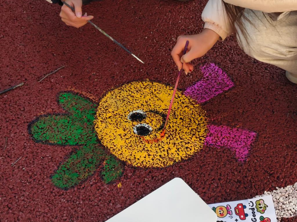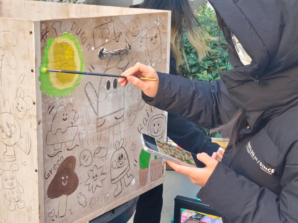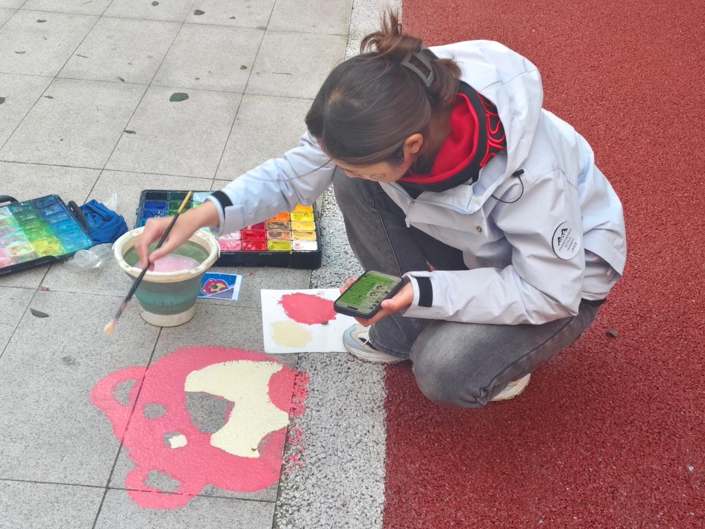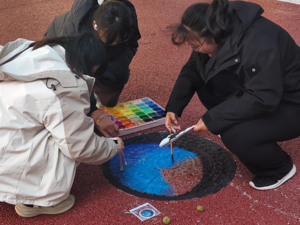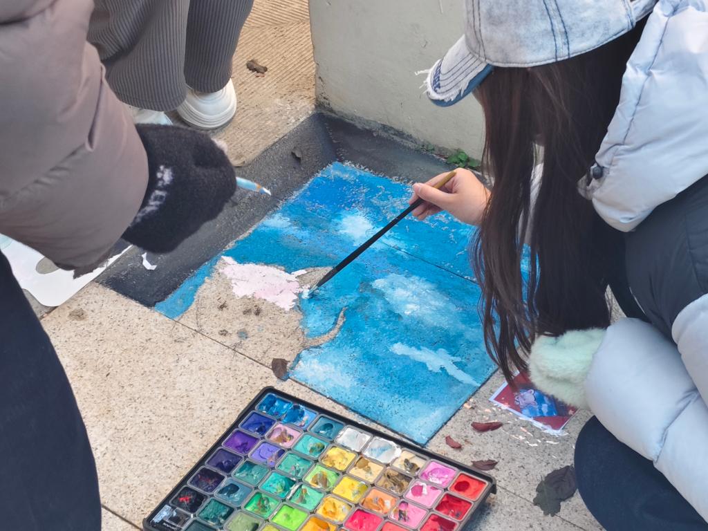 在本次活动中,各专业同学首先分组讨论了设计方案,确定了方案后,便带着画笔与颜料走进宿舍楼下,开始了现场创作。同学们俯身执笔,悉心描绘,一幅幅生动的画面在笔下徐徐展开。其中有同学围绕在井盖四周,俯身描绘着以蓝色为主调的海洋世界,还有同学在地面上绘制出了憨态可掬的小熊、活泼的小狗与灵动的锦鲤等形象。随着线条的勾勒与色彩的填充,一幅幅融入自然元素与校园生活场景的绘作逐渐成形。与此同时,公共区域的箱体前也有同学们专注创作的身影。他们先用水粉笔勾勒轮廓,再执笔细致上色,流畅的线条与卡通元素慢慢浮现,为原本单调的设施增添了生动的艺术气息。整个创作过程中,各组都格外用心,色彩搭配、线条精细度等细节都反复琢磨调整,一步步将心中的想法转化为眼前的艺术作品。