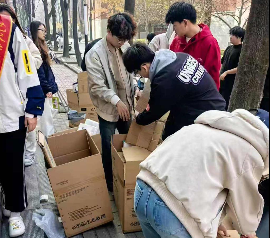 活动当天,志愿者们早早来到活动现场,设立分类回收点。同学们积极响应号召,纷纷将收集到的塑料瓶、快递纸箱等可回收物带到现场。志愿者们分工协作,使用专业工具对回收物品进行细致分类和称重记录。经过三个多小时的辛勤工作,共收集塑料瓶13.4公斤、各类纸箱173公斤,所有回收物已统一运送至指定回收点进行处理,实现资源循环利用,工作人员根据所捐物品的多少进行评奖。活动结束后,参与师生自觉清理现场,展现了良好的环保素养。