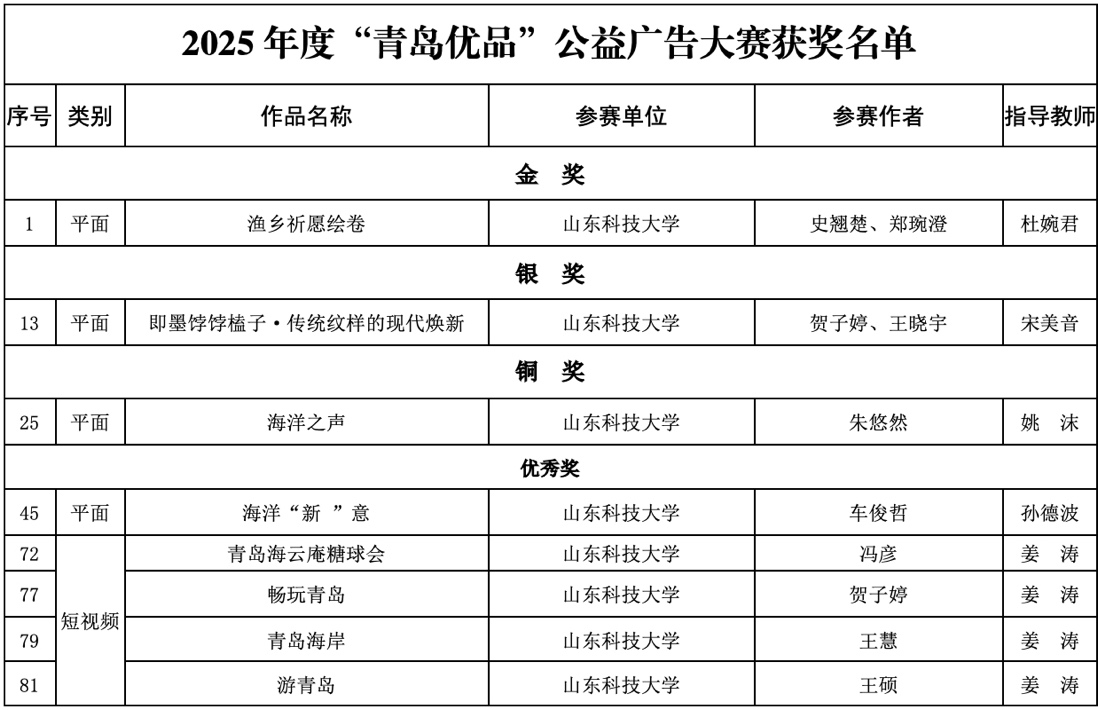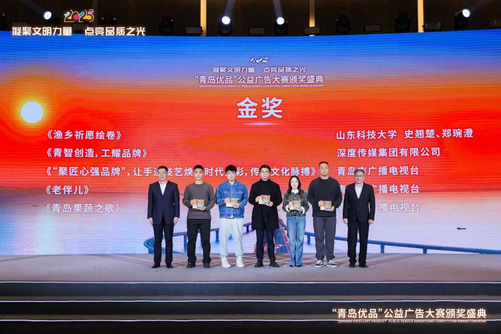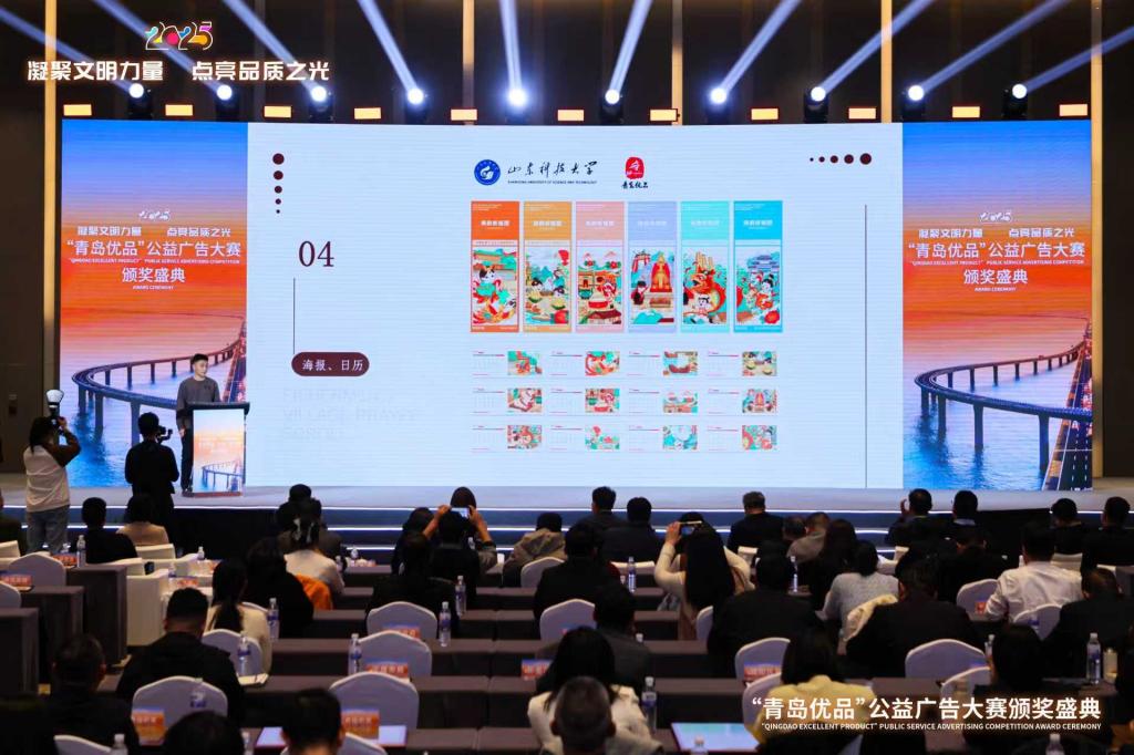 近日,由青岛市场监管局联合市委宣传部、市委网信办、市教育局、市文化和旅游局共同主办,青岛市广告协会承办的2025年度“青岛优品”公益广告大赛颁奖典礼顺利举行。在本次大赛中,艺术学院视觉传达设计系报送的作品从全国逾1300多件参赛佳作中脱颖而出,一举揽获金奖、银奖、铜奖各一项,优秀奖五项,展现了卓越的创新设计与深厚的艺术底蕴。同时,我院亦凭借出色的组织与指导工作,荣膺“优秀组织奖”荣誉称号。