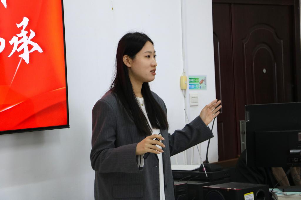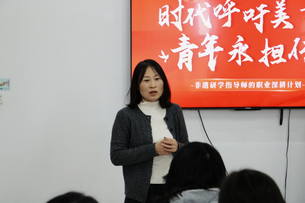 活动开始,杨淼作为优秀选手代表上台分享,她以《非遗研学设计师》为主题,自信从容地阐述自己的职业愿景,通过精心制作的多媒体材料,系统讲解非遗研学设计师的工作内容、市场需求与发展前景,既有扎实的数据支撑,又有生动的案例分析,还分享了自己与本地非遗传承人合作、在小学试点非遗体验课程的实践经历。